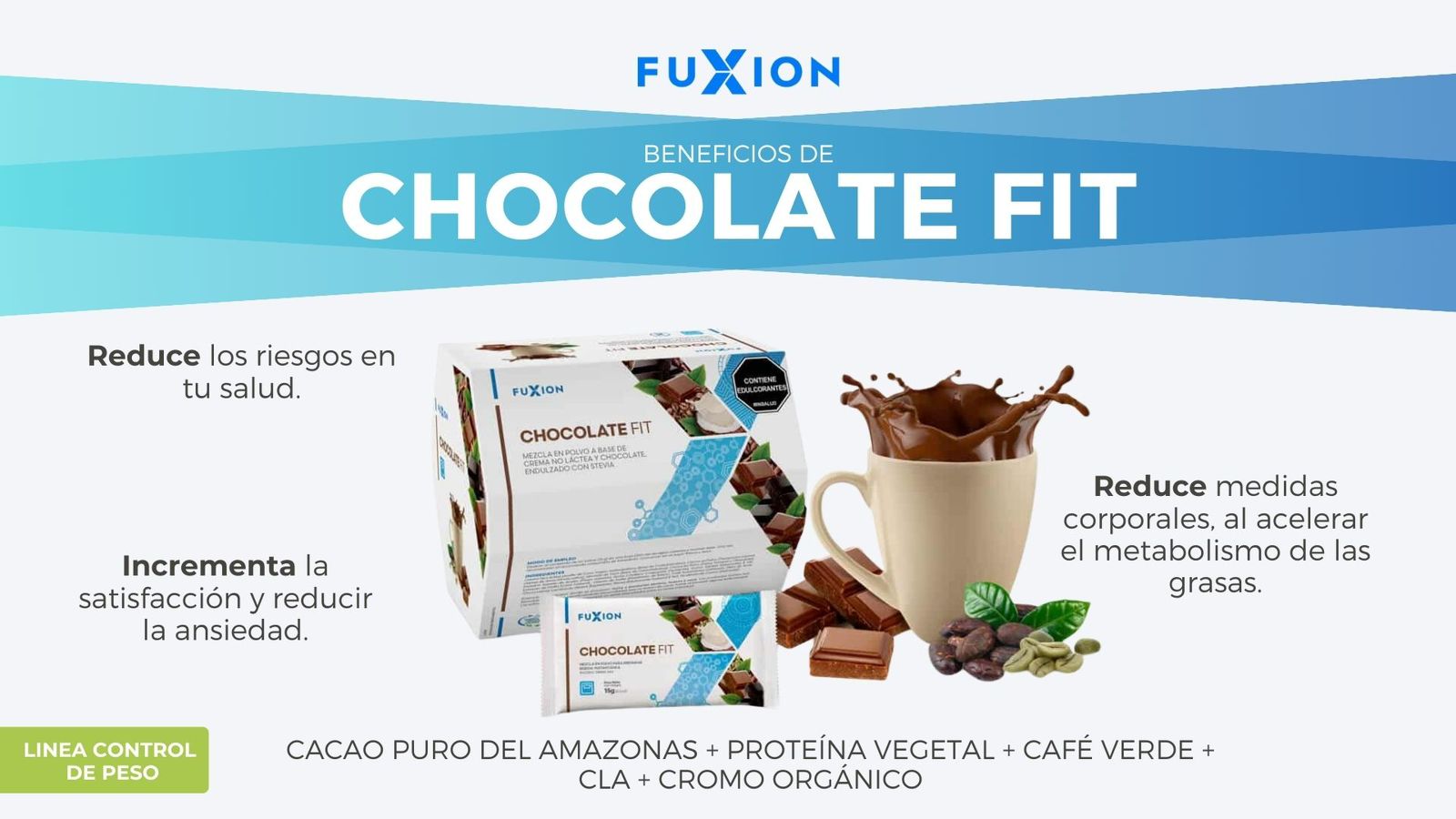 A diferencia de los chocolates tradicionales cargados de azúcar y grasas, Chocolate Fit Fuxion contiene ingredientes funcionales como proteína vegetal, fibra prebiótica, vitaminas, minerales y antioxidantes, que contribuyen a mantener tu metabolismo activo y tu cuerpo en equilibrio.