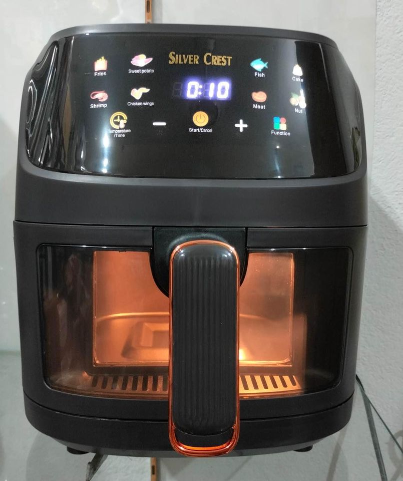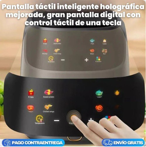 Con su capacidad de 10 litros, esta freidora es perfecta para familias, reuniones o para preparar grandes porciones en una sola cocción. Su panel táctil digital facilita el uso, permitiendo ajustar temperatura, tiempo y seleccionar entre distintos modos automáticos de cocción, como papas fritas, pollo, pescado, pasteles y más.