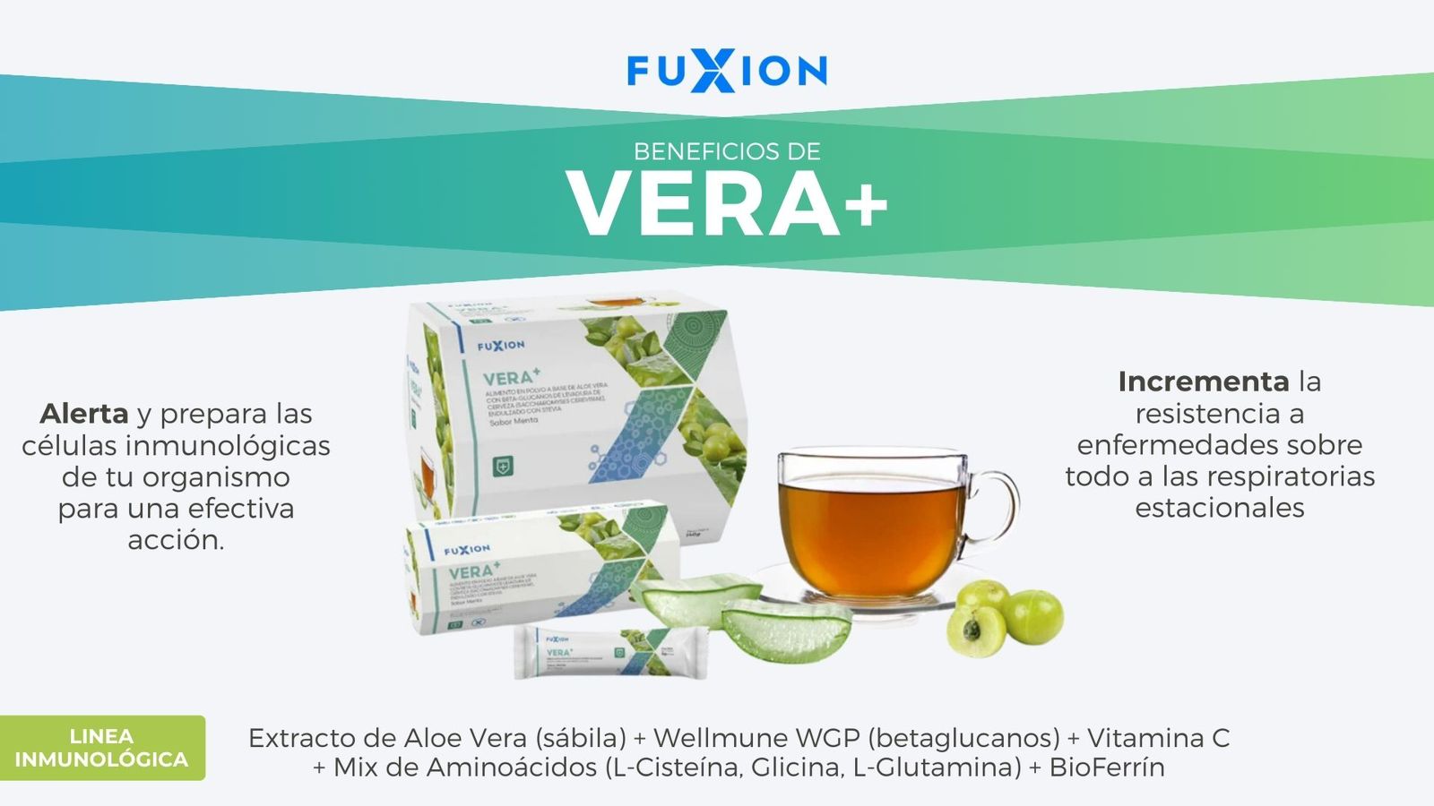 El Vera+ Fuxion es una bebida funcional elaborada a base de sábila (aloe vera), colágeno hidrolizado, antioxidantes y extractos naturales, formulada para promover la regeneración celular, el bienestar digestivo y una piel más saludable desde adentro. Gracias a su fórmula única, Vera+ Fuxion ayuda a equilibrar el organismo, aportando hidratación, elasticidad y vitalidad.